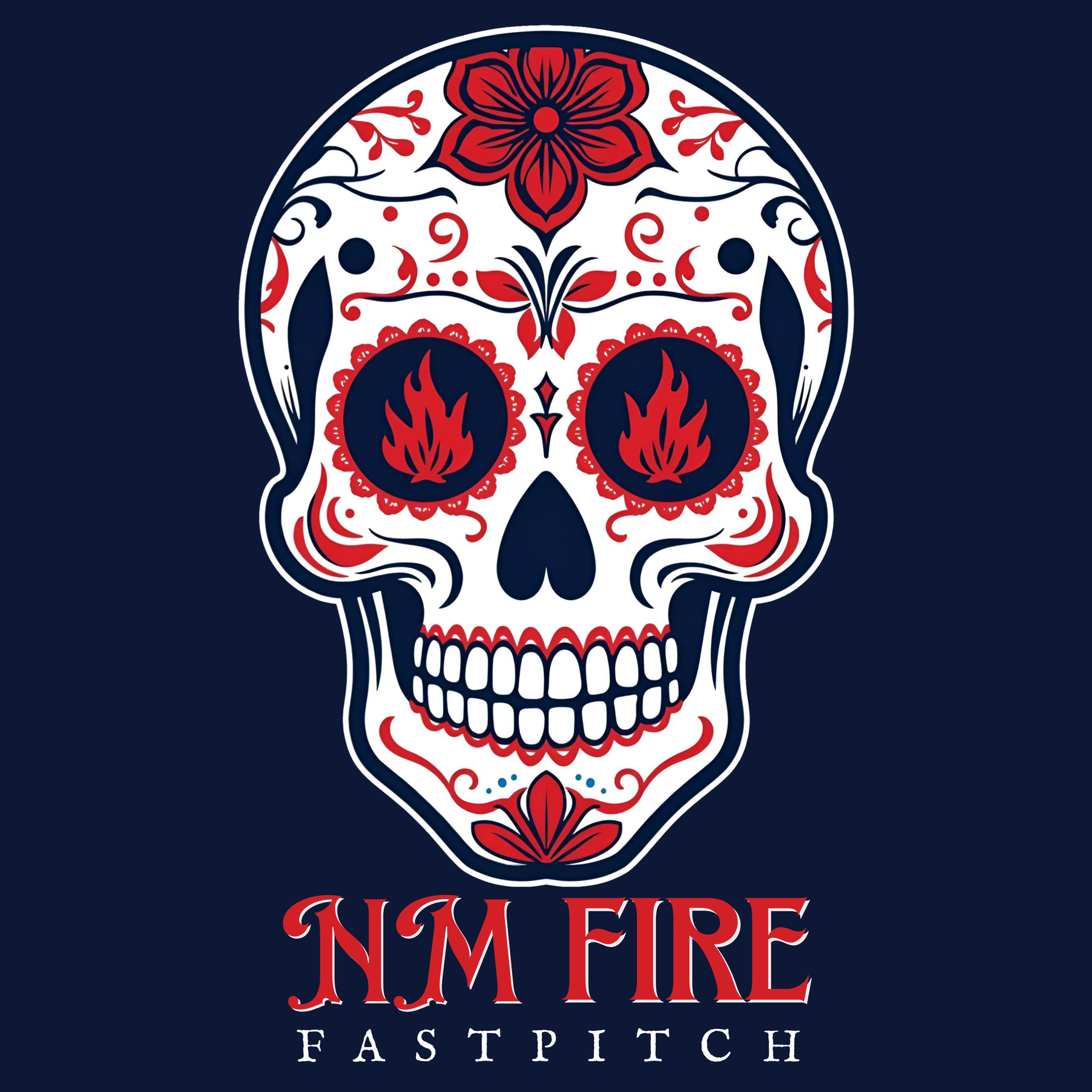 Made for the fans who love tradition, culture, and fierce design. This custom NM Fire sugar skull blends bold lines with fastpitch fire accents — a striking mix of Southwest personality and team pride.